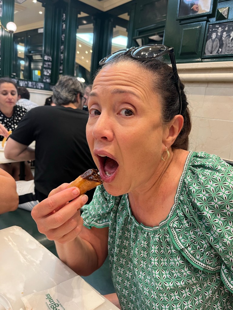 For something sweet, we went to Chocolatería San Ginés. This chocolatería has been in existence since 1894. It’s a small place but has huge flavor, especially the chocolate. For a snack, we ordered churros and porras (BIG, THICK churros) with melted chocolate for dipping. Oh My Goodness was that good. Anna and I would have licked the cups if we would not be seen. Unfortunately, there were other patrons that would most likely not appreciate such an action.