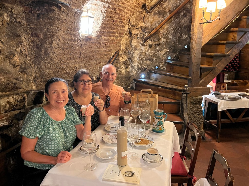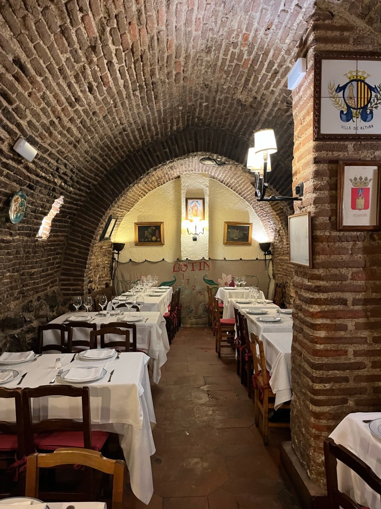 In addition to the Chocolatería de Ginés, we had a late lunch/early dinner at Sobrino de Botín. This restaurant has been in business since 1725 and the building where it is housed dates back to 1580. The menu includes Spaniard cuisine with specialties such as Morcillas de Burgos (blood sausage from Burgos), Cordero Asado (roast baby lamb), and Ensalada Riojana (salad from the Rioja wine country). The sangria was exceptional as well as the desserts except for Jim’s flan which he did not like as much. Annie and I both had a taste and thought it was good. The food was so good, we forgot to take pictures again. However, the ambience was photo worthy.