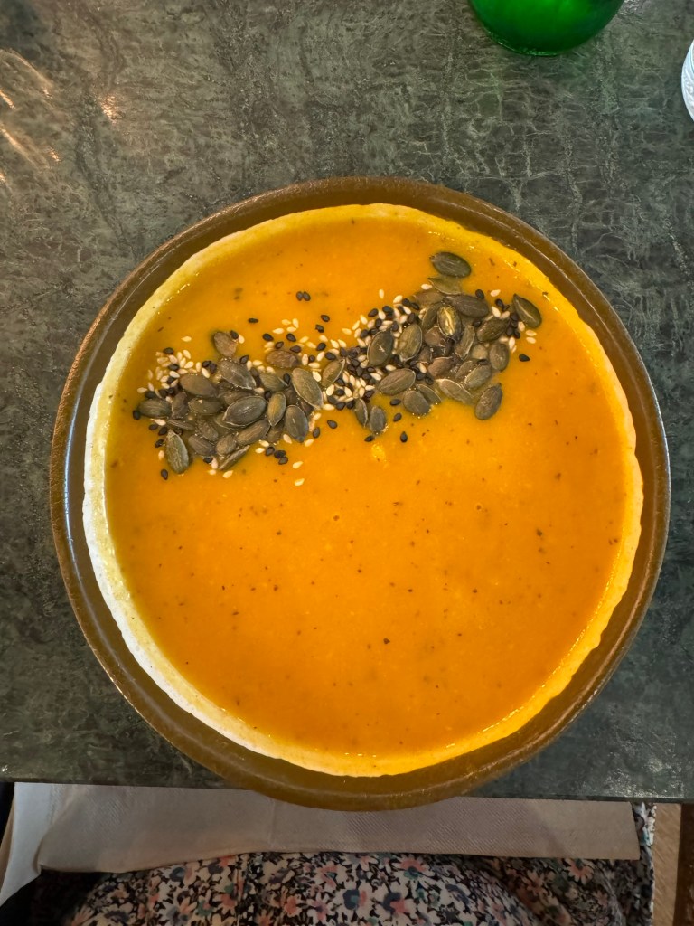 In addition to history and art, the variety of food is plentiful. Typical Portuguese food includes cod fish (bacalhau), seafood rice, pork and of course pastel de nata, a delicate round pastry filled with custard. Unfortunately, my hunger overtook the need for pictures. However, here’s one I took from tonight’s dinner – yummy pumpkin soup.