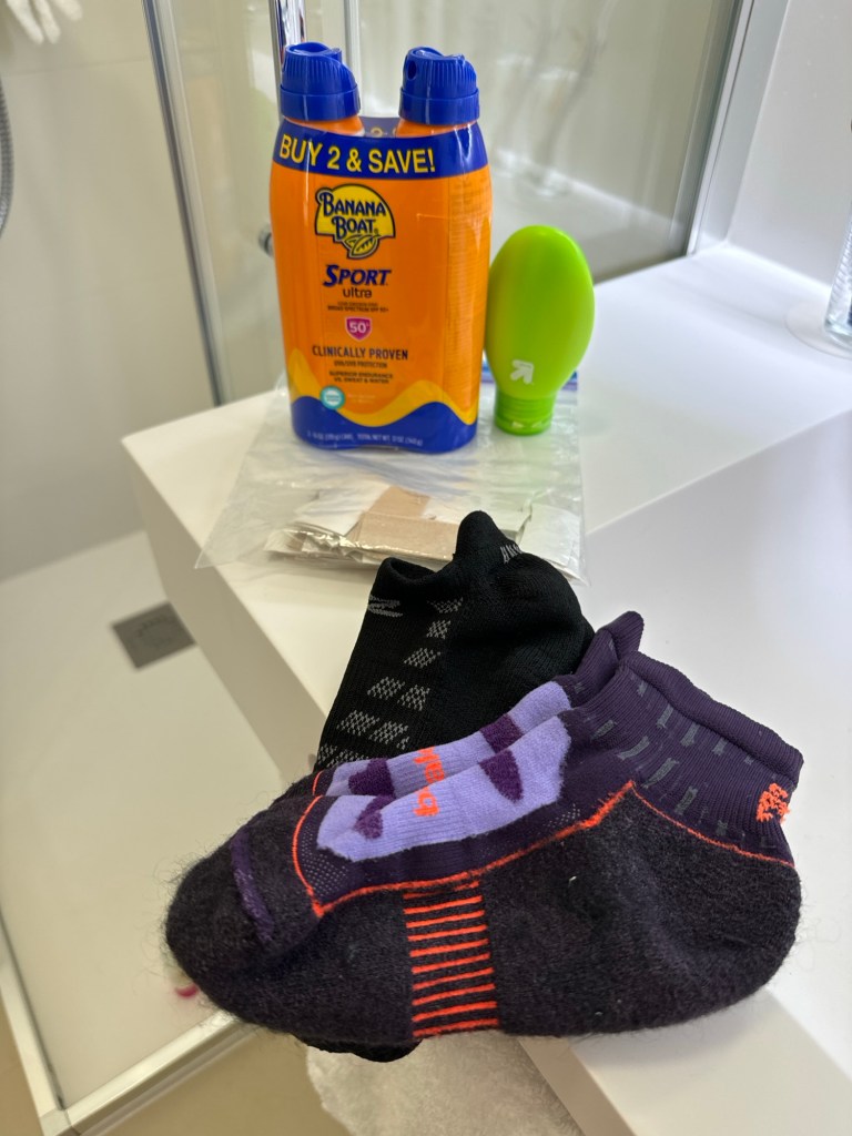 We’re also mindful of protecting our skin. Sunscreen is applied, hats are on and arm sleeves are dutifully worn. We also spend time preparing the most important body part of this journey, our feet. I make sure to apply patches of moleskin on my hotspots. Jim wears double socks every day. Whatever works for each of us is what we follow.