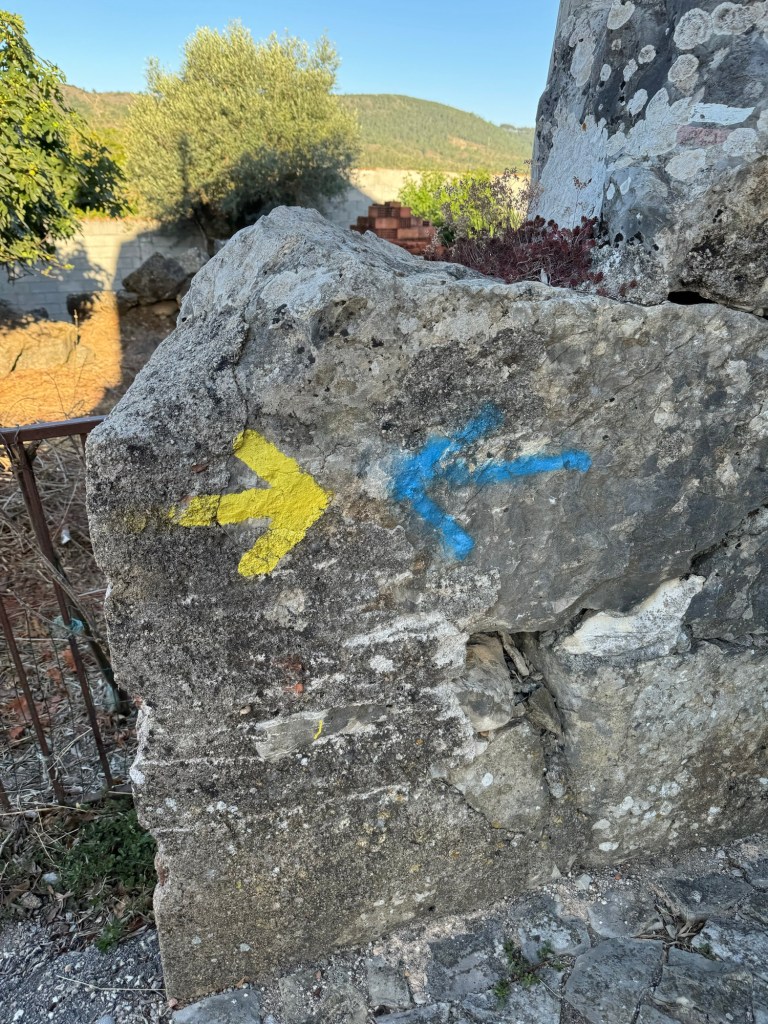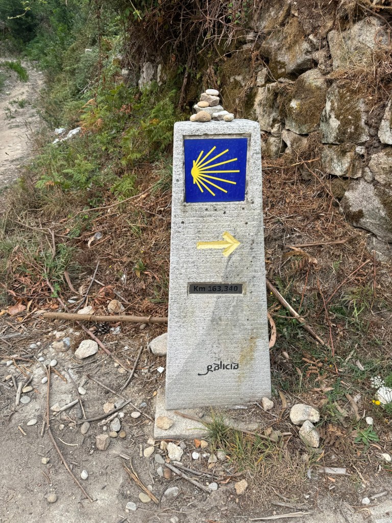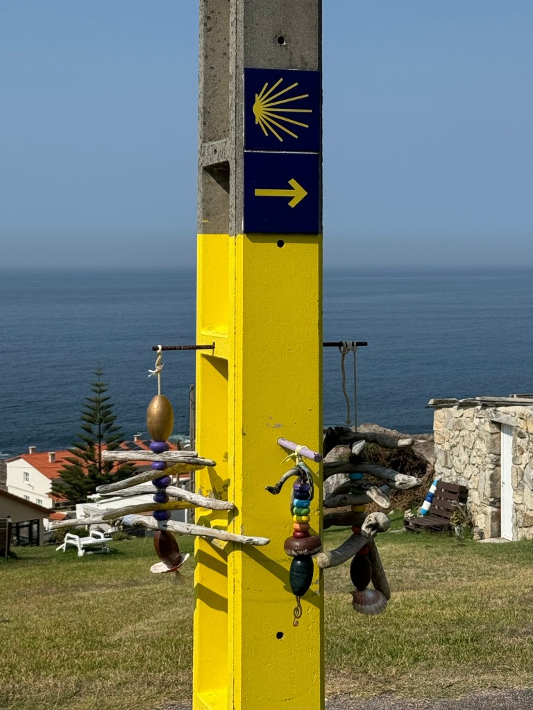 Directionality is a crucial part of walking the Camino. It is very easy to get off course and wind up having to back track or worse yet walking an additional three miles, which trust me no pilgrim wants to do, EVER! To avoid taking a wrong turn, we look for signs, literally. A yellow arrow, a blue plastic plaque with the Camino symbol (the shell) and an arrow, or a concrete post with arrows and mileage left to get to Santiago. Here are some that we’ve seen.