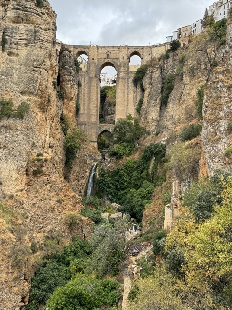 Ronda is a much larger city with approximately 35,000 people. It has a dual claim to fame. One is that it is the place where Orson Welles spent much time and wanted to be buried. The other is that it has the Puente Nuevo (built between 1751 and 1793) which stands 390 feet above the canyon floor making for an impressive sight.