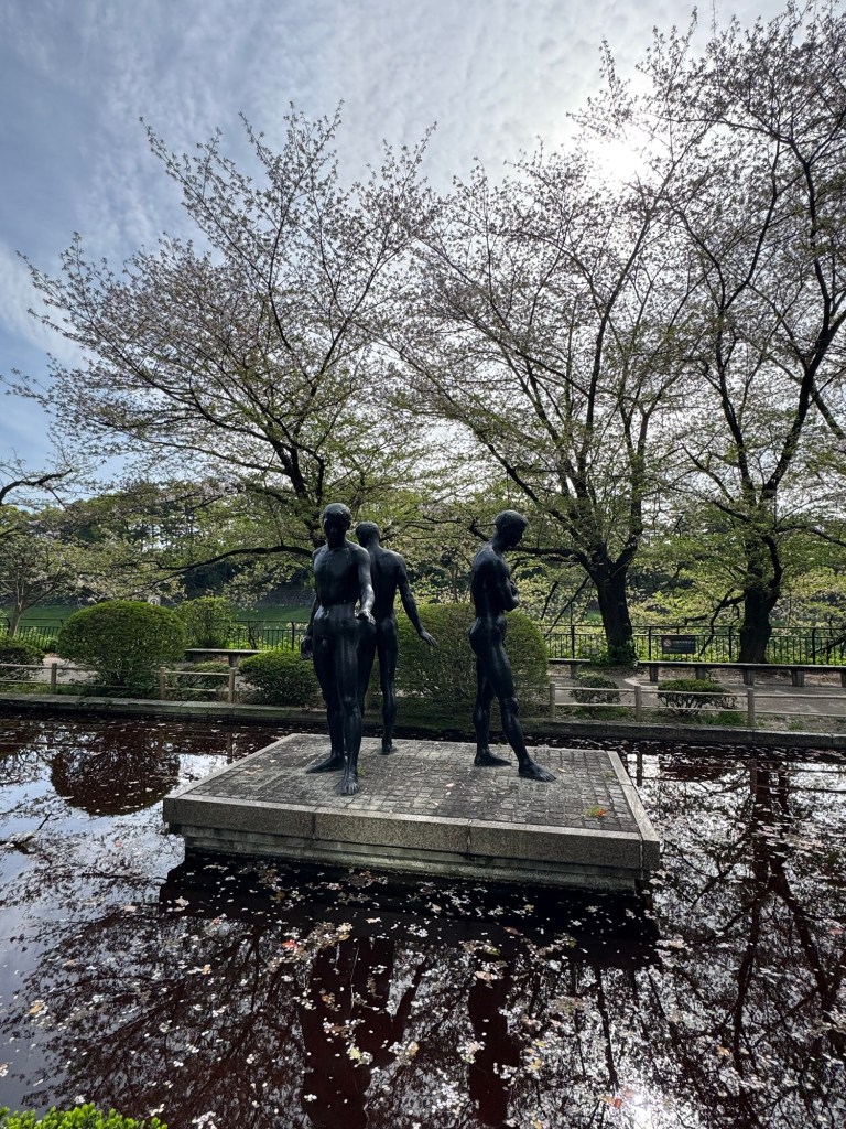 Even though the above touristy spots are filled with people, there are other spots in Tokyo that are quieter, more spacious and lovely to explore. Two other places we visited this day were the perimeter of the park where the Imperial Palace is located and the Meiji-Jingu Shrine. Unfortunately, the season for entry to the Imperial Palace does not begin until April 14th, the day we depart for Hiroshima; therefore, we couldn’t go into the grounds or take a tour of the palace. However, the area where the Meiji-Jingu Shrine is located was open and proved to be a tranquil spot in the middle of this metropolitan city.
