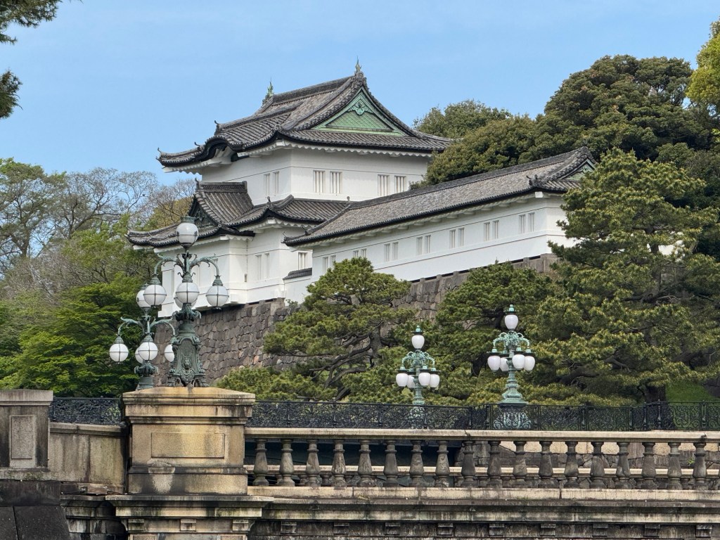 View of the Imperial Palace from outside the park grounds. The original palace was completed in 1888 as commissioned by Emperor Meiji. During WW II, the palace was destroyed, but completion of the rebuilding happened in 1968.